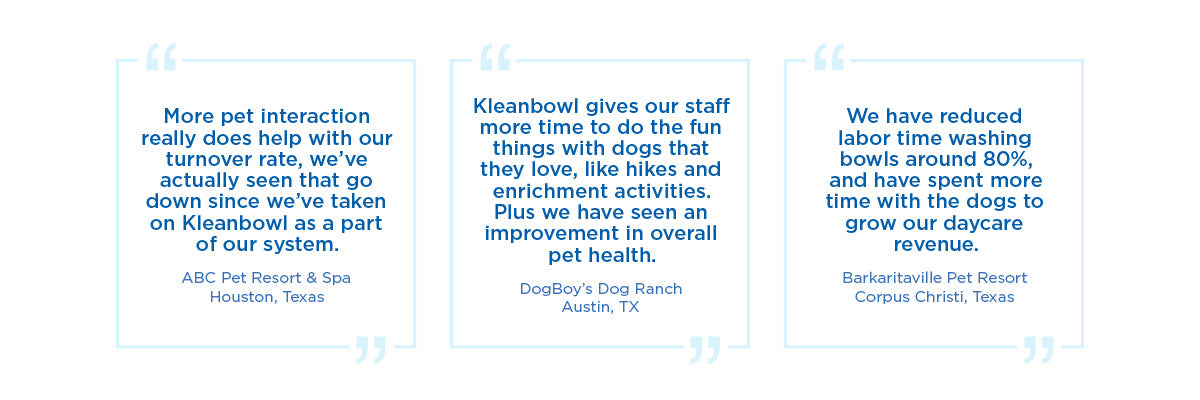 Instantly see your guaranteed savings & sustainability improvements at KleanbowlEstimator.com. Labor time savings can be immediately reinvested to grow other pet care services such as daycare, grooming, or other rehabilitation programs. Enjoy improved employee morale and staff retention when you remove the painstaking task of having to wash dozens and dozens of pet food and water bowls daily.