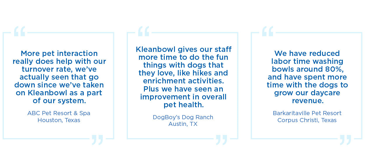 Instantly see your guaranteed savings & sustainability improvements at KleanbowlEstimator.com. Labor time savings can be immediately reinvested to grow other pet care services such as daycare, grooming, or other rehabilitation programs. Enjoy improved employee morale and staff retention when you remove the painstaking task of having to wash dozens and dozens of pet food and water bowls daily.