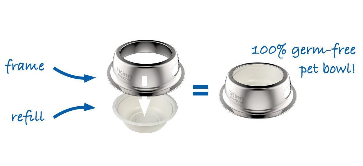 Kinn Kleanbowl is an innovative 2-part system designed for simplicity and efficiency. It starts with assigning a sturdy frame to each pet’s enclosure, ready to hold the refillable bowls filled with food or water. The magic lies in its low maintenance – a quick wipe to clean the frame as needed, recycling the used refills, and a simple sanitizing of the frame when a pet’s stay concludes – all part of a day’s work made easier and more efficient with Kinn Kleanbowl.