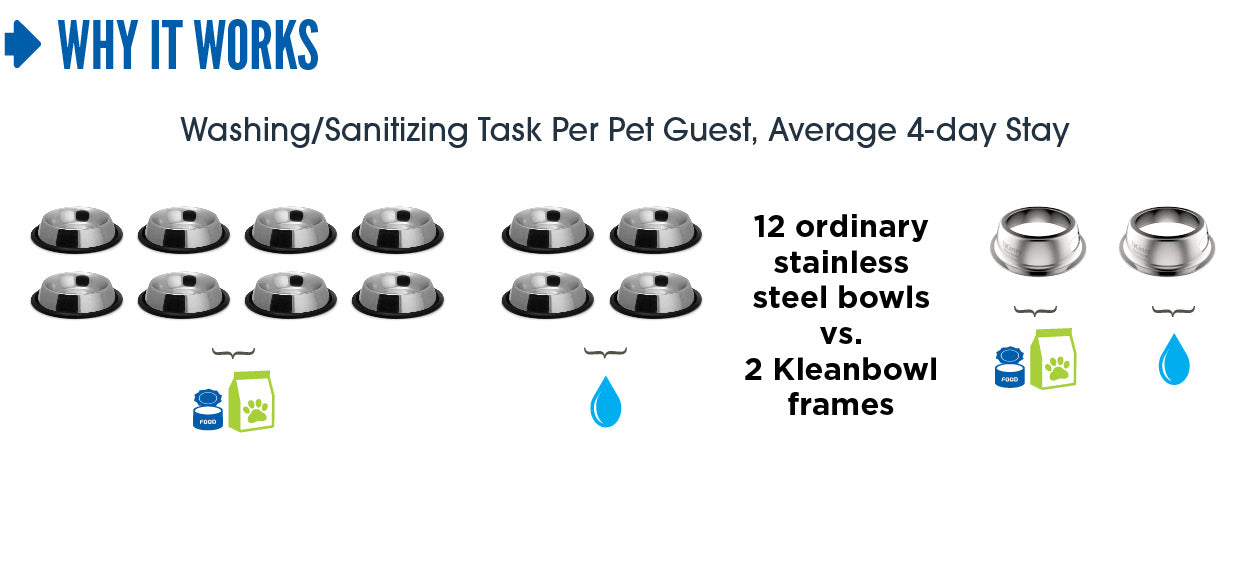Go from washing 12 ordinary bowls to sanitizing 2 Kleanbowl frames during an average 4-day pet stay.